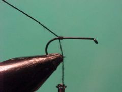 2. You don’t need to lay down a bed of thread/cotton along the hook shank for this fly because the body of the fly is thread so start by tying in the cotton at about the 5% position wind the cotton in touching turns to the bend of the hook.