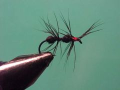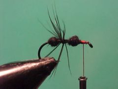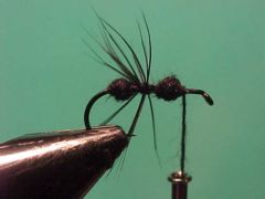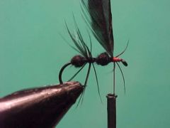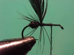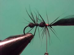 Size 12 Knapek Dry Black cotton Black cotton treated with fly floatant Black hackle Rust coloured thread