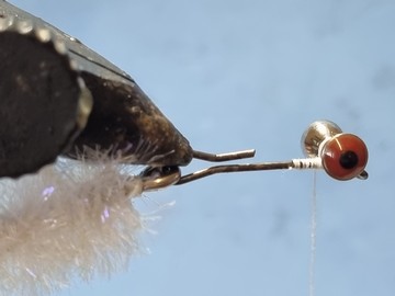 - Rotate the hook in the vice and using tight figure of eight wraps tie in a set of dumbbell eyes in behind the eye of the articulated shank.