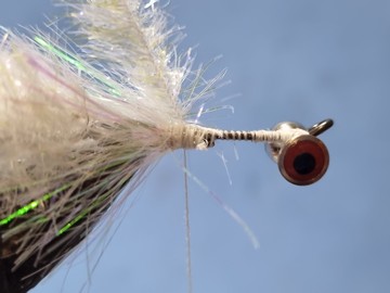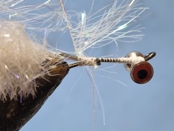 - Tie the hackle off directly behind the dumbbell eyes, trim away the excess thread, whip finish behind the dumbbell eyes and apply a coat of head cement or super glue to the whip finish.