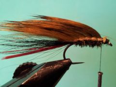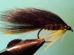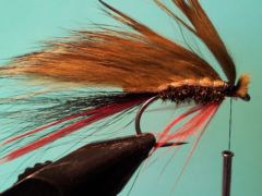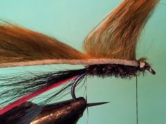One of my top 10 trout flies is my Kalkite special. It’s no surprise therefore that I have a cousin to that fly, perhaps with a little influence from the yeti fly, in my bass fly box. Unlike the trout Kalkite special fly I seldom fish this fly as a single fly but find that if fished on a dropper about 1.2 meters above one of my preferred point flies it works like a dream. I tie it with a choice of three different colours in zonker strips(olive,black and brown) and hot spot tails and beards in both red and chartreuse. In some of my ties I also include eyes of slips of silver holographic tinsel as seen in the third photo above.