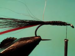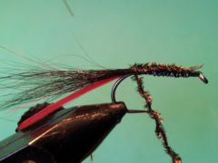 Size 6-10 Hanak 900BL Black Lead wire Red or chartreuse hackle fibers Black buck tail hair Fine copper, silver or gold wire Peacock herl Olive, black or brown rabbit fur Red or chartreuse hackle fibers Silver holographic tinsel slips