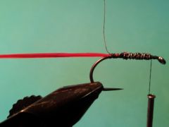 3. Tie in a length of 0.015 lead wire and take 10 wraps toward the eye of the hook.