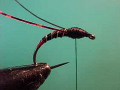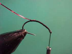 - Tie in a length of fine silver wire on the top of the hook shank.