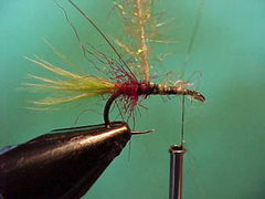 - Tie in a length of Estaz chenille also directly in front of the butt of red squirrel fur.
