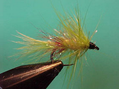 There are plenty of “Blobs” around but many of them look very much as the name suggests – just a blob of fur and feather. This is a “blob with attitude” and because it actually looks like a fly I find it a little easier to tie on than its very basic second cousins. It has a place in my fly box because from time to time, and particularly in competition fly fishing, you find yourself fishing in the most unpleasant conditions. If the wind is blowing at 30 kilometres an hour the waves are at the gunnels and your having to strip as fast as you can just to keep the team of flies in front of the boat and the fish are down then you do have to ask yourself will they see my team of flies. In situations like that a blob with attitude may save the day. I tie it in as my middle dropper in those circumstances and fish all the likely water that I can. I have been amazed with the pulling power of this fly. It doesn’t get many takes itself but it does lead fish to your other more more traditional flies.