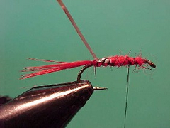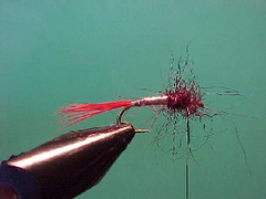 - Dub on a loose thorax of claret seals fur and using a bit of Velcro tease out some of the seals fur fibres so that the thorax is bushy.