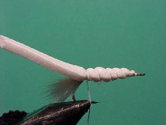 - Wind the thread 3/4 of the way along the hook shank and take two or three tight wraps of thread locking a length of closed cell foam that is about as wide as the gape of the hook into that position.