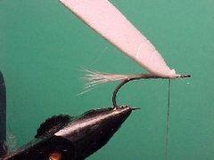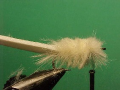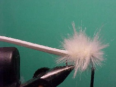 - Wind the dubbing rope toward the eye of the hook in touching turns stroking back the loose fibres at each wrap of the thread so that the next wrap of the thread doesn’t tie any of the fibres down.