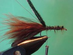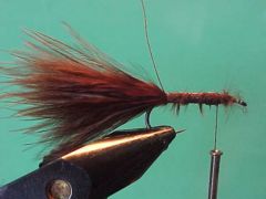 Size 6 to 10 Knapek L or Jig,Tiemco 3769 or similar medium shank hooks with wide gapes Brown 6/0 Uni thread 0.015 or 0.010 mm lead wire Brown Marabou Butt ends of the marabou and if necessary dubbing or wool Copper wire Peacock herl Grizzly hackle died brown
