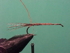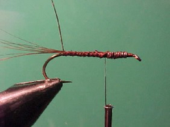 1. Using the single strand dubbing method dub on a body starting at almost nothing and gradually increasing in width along the back half of the fly.