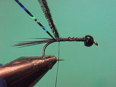 1. Take just enough wraps of the herl to fill the gap behind the bead, tie the herl off and trim the excess.