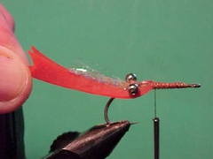 - Tie in a small bunch of Super hair and a couple of bits of Pearl Flash or Krystal flash to represent the sieves and mouth parts. These are tied in very much as a tail would be tied in on a fly.