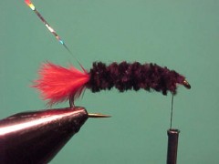 - Bare the first 5 mm of a length of chenille and tie the bare core of the chenille in along the top of the hook shank with the chenille wadding tight up against the bend of the hook.