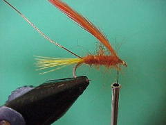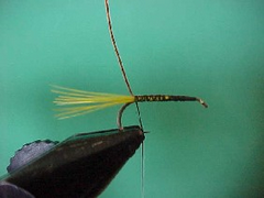 - Tie in a tail of yellow hackle fibres about as long as the shank of the hook.