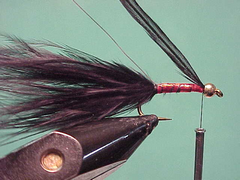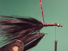 4. Tie in a woolly bugger type tail. I don’t add the tinsel as in the traditional woolly bugger type tail but you can if you think your fly needs the extra bit of flash. This is one of those flies where the under-body must be uniform so if when you tied the marabou tail in you were left with ridges along the body use a bit of dubbing to fill those gaps in.