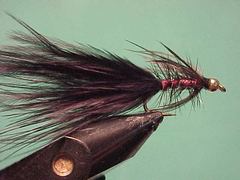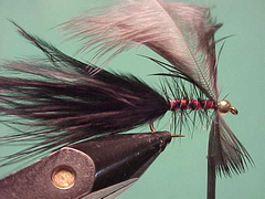 Medium shank such as Tiemco 3769 Black For #8 hook a 3.2 mm silver tungsten bead works well Black marabou Medium silver wire Red holographic tinsel Black hen hackle Crow breast feather
