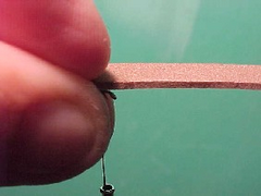 - Hold the closed cell foam in position onto the top of the hook shank at the tie down point with the fingers of your left hand.