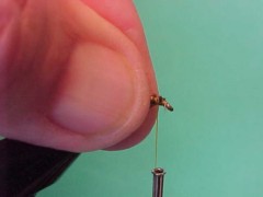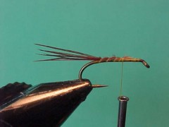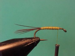 - Wind the ribbing wire forward forming 7 or 8 segments along the body of the fly.
