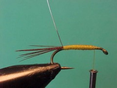 - Tie ina length of ribbing material at the bend of the hook.