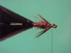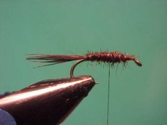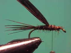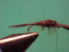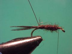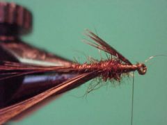 - Turn the fly over in the vice and tie in 6 or so pheasant tail barbule tips in the space left for the front half of the thorax to represent the legs on the other side of the fly.