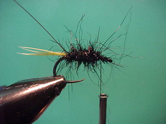 Seldom, at least in my case, fished alone this fly is a great top dropper or bob fly when lock style fly fishing. I particularly find it useful when yellow winged hoppers or other insects with yellow parts are on the trouts menu. It looks nothing like a hopper of course but I think the little bit of yellow in the tail as well as the movement of the fuzzeled body and the soft front hackle are often enough to trigger a response.