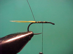 - Dub on a slightly round cigar shaped body along the rear 4/5 of the hook shank.