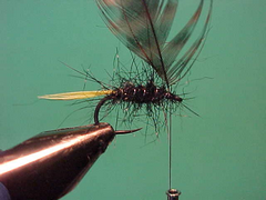 - Tie a badger hackle that has been died brown by the butt in the gap between the eye of the hook and the body of the fly.