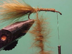 1. Wind the dubbing rope forward to the eye of the hook in touching turns stroking the fibres back toward the tail as you proceed.