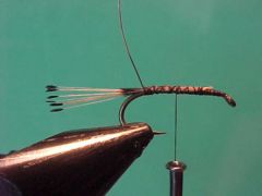 - Directly in front of the body tie in hackle with the shiny side forward.