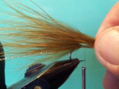 1. Tie in, at the bend of the hook and on top of the hook shank, a marabou or rabbit fur tag about 1/3 to 1/2 the length of the hook shank.