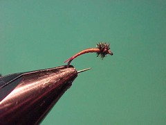There are a number of pupa that are very small yet still very important protein sources on the trouts menu. These include the pupa of midges i.e. Chironomids and of course pupa of what is often called ‘anglers cure’ or ‘smut flies’ but really are the emerging nymph of the Caenis Mayflies. In any case when fish are on these, and other very small pupa, because they occur in such large numbers they often go into a feeding pattern that excludes other food sources. If that’s the case you do want a small fly to offer them but then its a trade of between getting a hit and having a hook that will stick to and hold the fish. This fly may do the job. as its tied on a Wingaersheek grub hook which has a better than average gape and bite for its size.