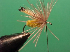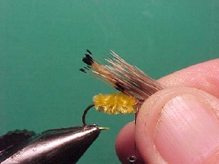 - Tie in 15 or 20 Golden Pheasant feather tippets creating a down wing that is about as long as the hook.
