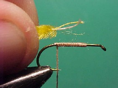 - Tie the chenille in at the bend of the hook by the exposed chord and wind it forward along the rear 2/3 of the hook shank in touching turns.