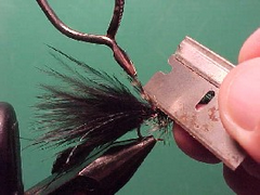 - Trim the excess hackle at the bend of the hook with a blade. By using a blade an not scissors you don’t run the risk of cutting off barbules from the Palmered hackle that should be retained.