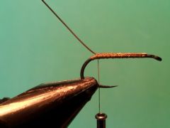 - Lift the wire up and take a few turns of the thread slightly round the bend of the hook just to form the rear taper of the nymph body.
