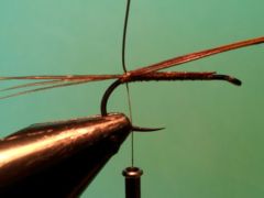 - Tie in 3 to 5 long Pheasant tail fibres with just a couple of turns of thread in front and behind the copper wire. The tips should form a tail no longer than the length of the hook shank. Resist the temptation to make the tail too bulky and too long. Looking at the original tie above I probably tie the tail a little long so feel free to shorten it down if that suits you.