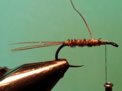 - Whilst winding the thread from the 95% position to the bend of the hook tie ina length of copper wire along the top of the hook shank.