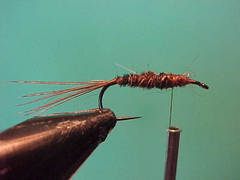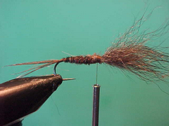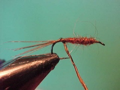 Wing: Brown or natural possum fur, tied so it lays back over the hook, giving it the same profile as a natural dun wing.