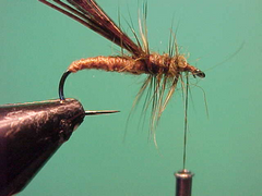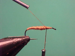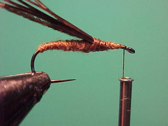 4. Load your thread with a small amount of dubbing and as you wind back to the 2/3 position dub ona thorax just a little thicker than the rear 2/3 of the fly.