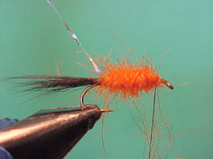 - Tie an orange hackle in just behind the eye of the hook by the tip.