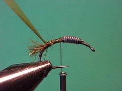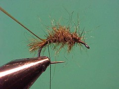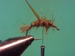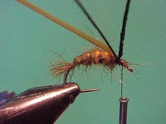 1. Using the single strand dubbing method dub on a loose body along the rear 3/4 of the hook shank but finishing with the thread back toward the bend of the hook but a little forward of where the scud back is tied in.