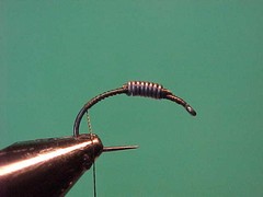 3. Tie in a length of lead wire and take 8 or 9 wraps round the shank of the hook. (I used 8 wraps of 0.020 mm lead wire on this size #10 hook).