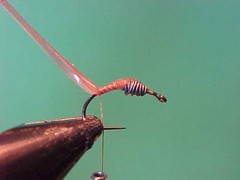 - Pull the scud back over the top of the hook and tie it off just behind the eye of the hook.