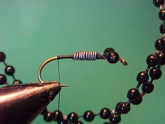 - Wind the thread down the next 1/3 of the hook shank and tie in a length of .020 mm lead wire.