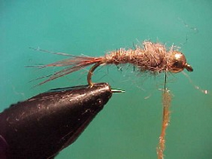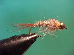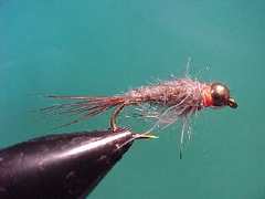 Designed to imitate a caddis grub this fly has additional weight so that it can be fished bouncing along the bottom or close to the bottom. It is very easy to tie and whilst it is not tied to represent any particular caddis grub it has a form and function and of course the hot spot added by the collar which are attractive to fish.