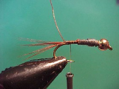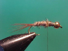 Tiemco 3761 size #8 to #14 Grey or light brown TBH + lead wire Ginger hen hackle fibres Fine copper wire 75/25 hares ear and grey UV dubbing UV dubbing or floss