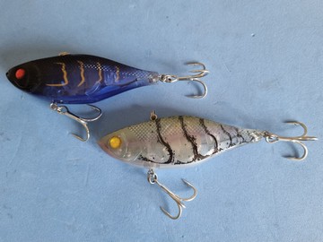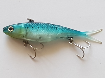 | SureCatch 110mm 20gram vibes. A relatively inexpensive online purchase these are a great lure to tie on when you want to Vibe in water where there is an unacceptable chance of loosing an expense Vibe. | Squirrel Transam are 100mm long and are at the more expensive end of the pricing range for Vibes that I carry. The hooks are also a little underdone so it is wise to upgrade them. | he Belista Juggernaut is unique in that it has a built in flashing light at the tail that comes on when the lure gets wet. We have had no success fishing this lure at night because it is just too bright but it comes into its own if fished during daylight hours in water carrying a lot of sediment. |