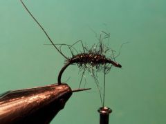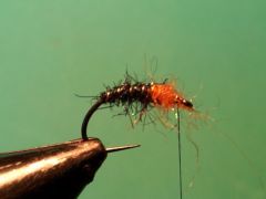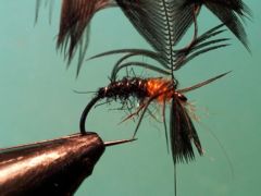 Knaped grub hook in size #14 Black Just the ribbing wire 6 wraps of medium 10 gr #30 copper wire Hends Spectra dubbing #46 (peacock) Hends Spectra dubbing #35 (burnt orange) Crow
