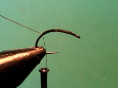 1. Select a small amount of dubbing and using the single strand dubbing technique dub a uniform body on the rear 2/3 of hook shank.